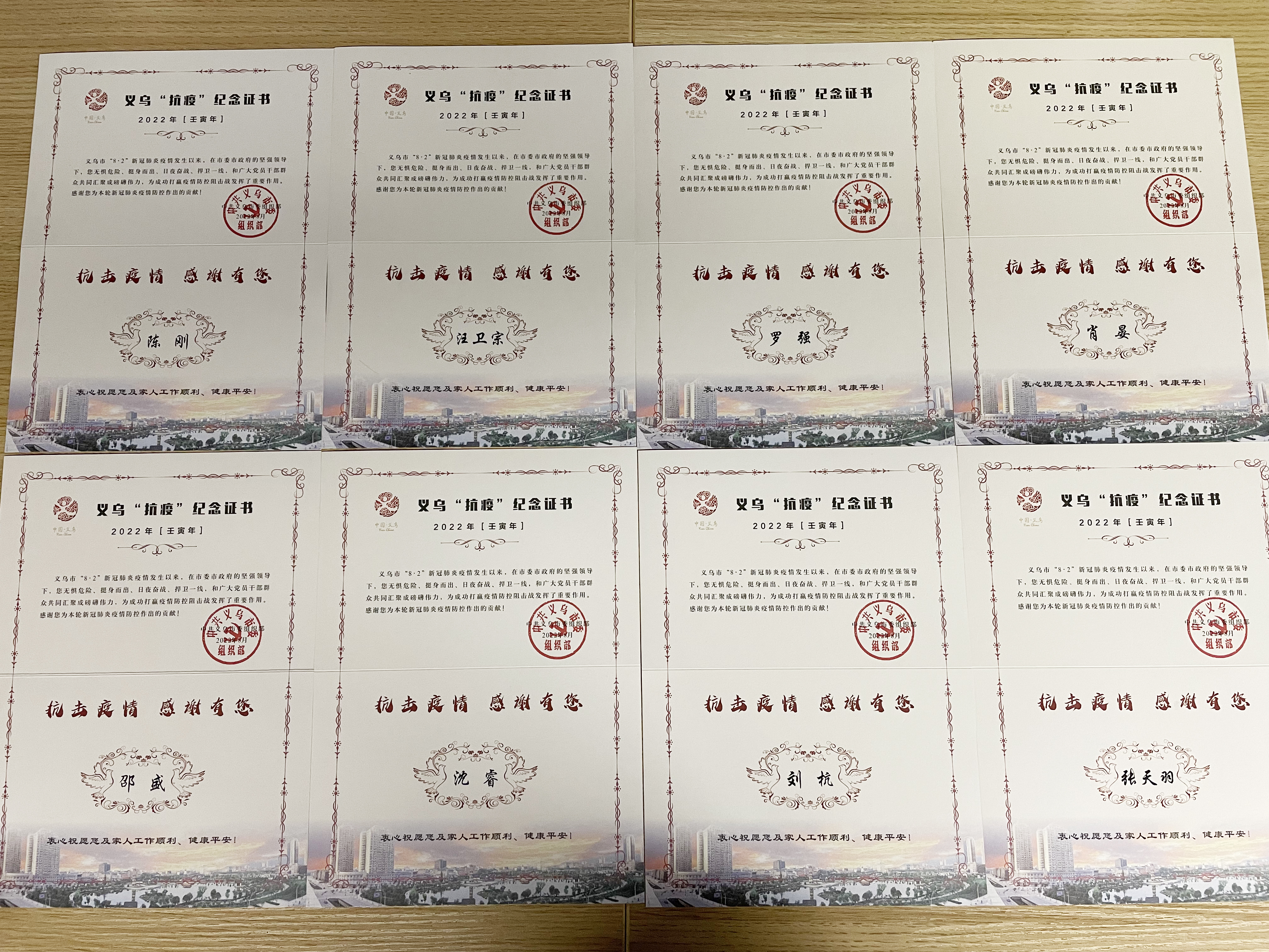 正是因為有無數(shù)來自各行各業(yè)的逆行者們,無懼危險、挺身而出、日夜奮戰(zhàn),這次義烏才能如此迅速地打贏這場疫情防控阻擊戰(zhàn),中共義烏市委組織部還為每一位在這次抗疫中作出過貢獻的個人,頒發(fā)了義烏“抗疫”紀念證書。