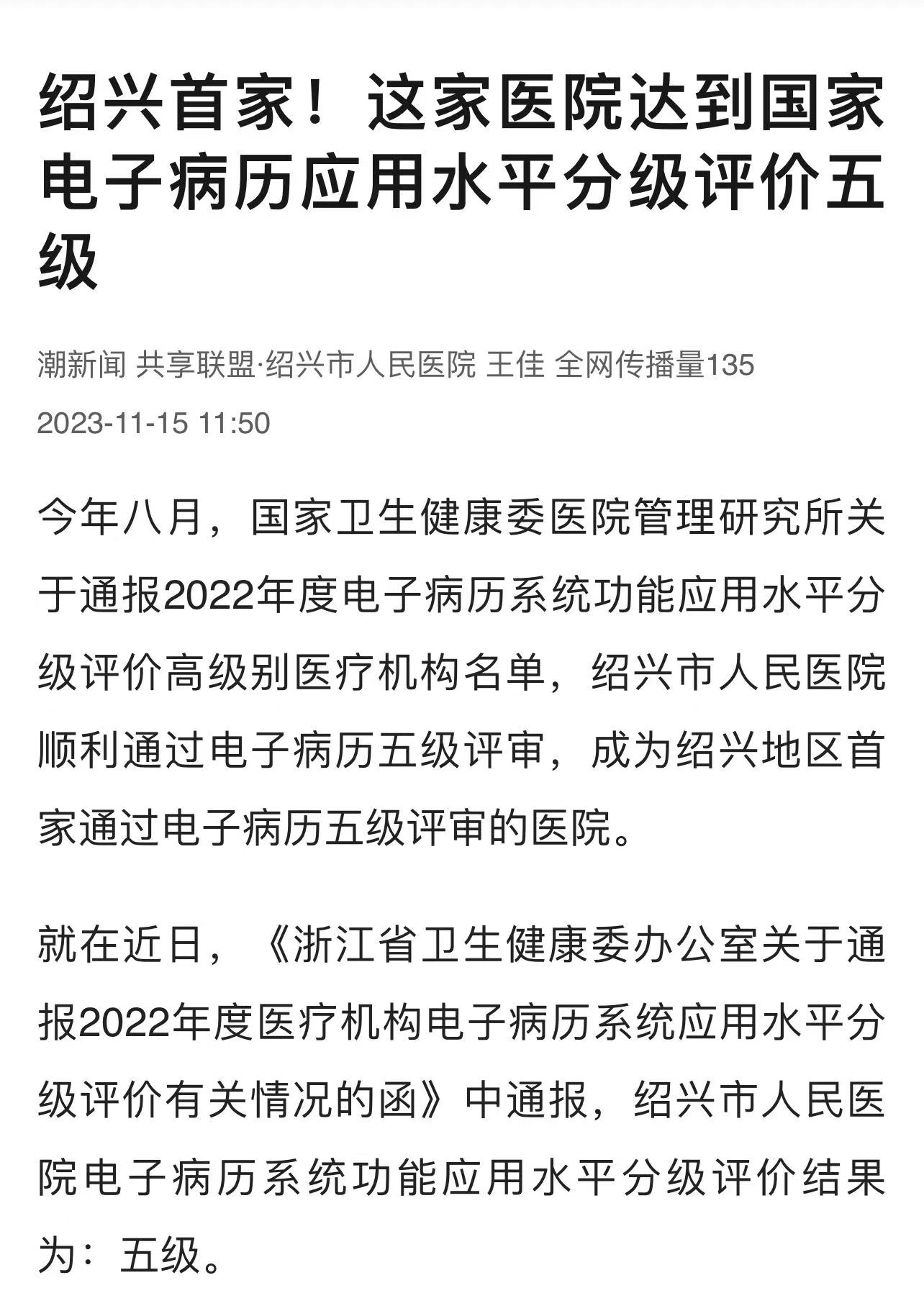 2023年8月8日,國家衛(wèi)生健康委醫(yī)院管理研究所關(guān)于通報(bào)2022年度電子病歷系統(tǒng)功能應(yīng)用水平分級(jí)評(píng)價(jià)高級(jí)別醫(yī)療機(jī)構(gòu)名單,紹興市人民醫(yī)院順利通過電子病歷五級(jí)評(píng)審,成為紹興地區(qū)首家通過電子病歷五級(jí)評(píng)審的醫(yī)院,標(biāo)志著紹興市人民醫(yī)院在智慧醫(yī)院建設(shè)、數(shù)字信息化、醫(yī)療質(zhì)量水平、醫(yī)院管理效能等領(lǐng)域邁上了一個(gè)新的臺(tái)階。