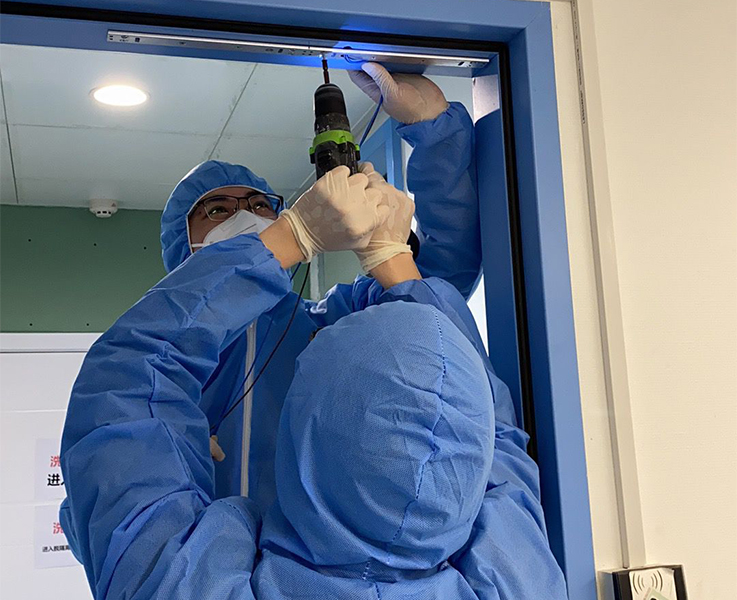在武漢同濟醫(yī)院中法新城院區(qū)被指定成為“武漢市新型冠狀病毒感染的肺炎危重病人救治定點醫(yī)院”后,為滿足包含傳染病區(qū)等在內(nèi)的20個病區(qū)共計1000張床位的管控要求,以及光谷院區(qū)的830張床位的改造需求。和仁科技服務(wù)團隊立即組織、協(xié)調(diào)資源,安排施工計劃和施工方案。同時,為保障項目高質(zhì)量、高標準完成,增派工程師駐場溝通、協(xié)調(diào)施工方案細節(jié)。和仁科技服務(wù)團隊克服時間緊、材料缺、施工難度大等問題,歷時兩天完成光谷院區(qū)的病房改造工作,六天完成中法新城院區(qū)的病房改造工作。