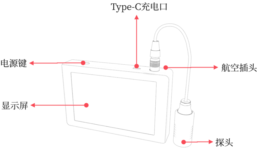 測量范圍 13-5500um (環氧樹脂涂層),300-14800um(45#鋼) 分辨率 1μm 測量精度 ≤±(3%H+3μm) H為標準值 聲速范圍 1000~9999m/s 最小測量區域 Φ6mm 顯示屏 800 * 480點陣IPS彩屏 單位 μm/mil 系統語言 簡體中文、英文 主機尺寸 141.7*91.1*22.6mm 探頭尺寸 Φ26*42.1mm 重量 475g 工作溫度范圍 0~40℃,0~85%RH(無凝露) 存儲溫度范圍 -10~50℃,0~85%RH(無凝露) 供電方式 可充電鋰電池3.7V@4000mAh 充電接口 USB(Type-C) 供電電壓 DC5V 工作電流 447mA 工作功耗 1475mW - 儀器操作